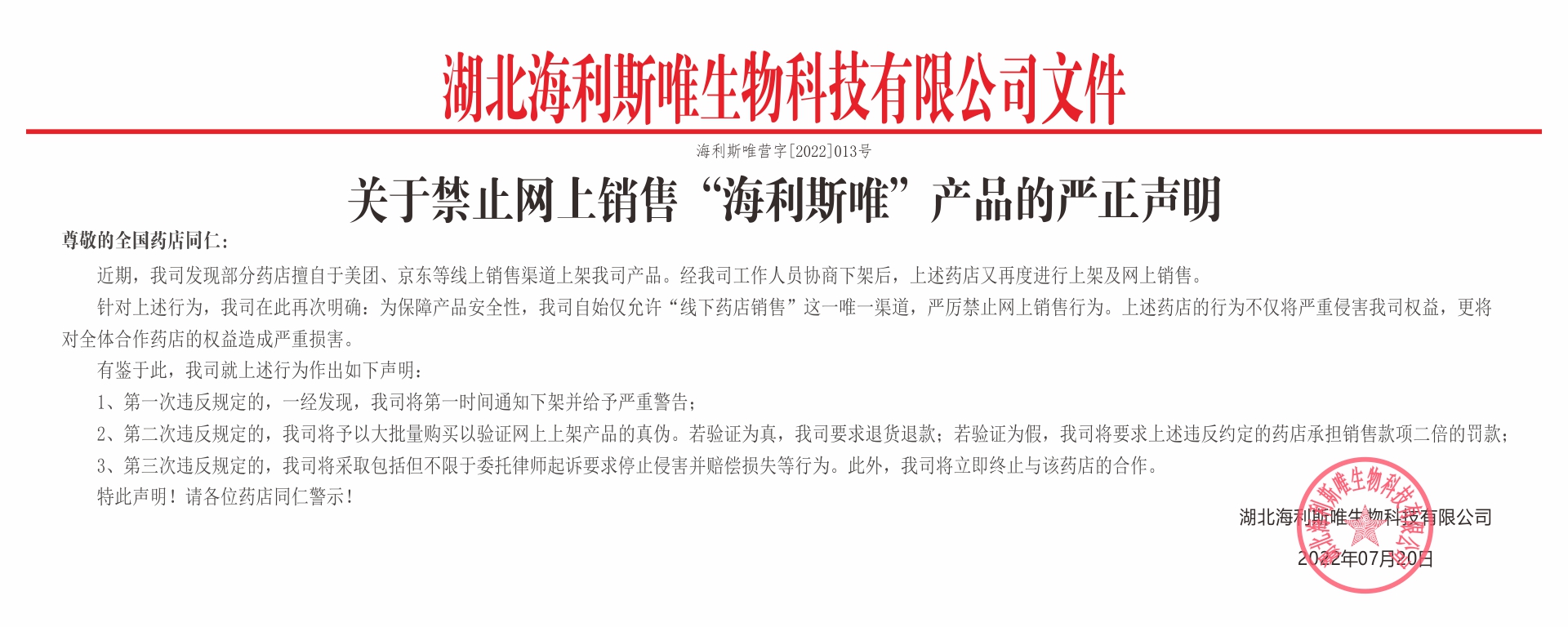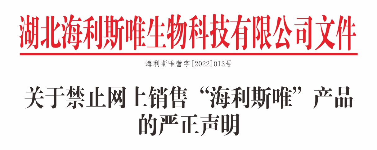 關(guān)于禁止網(wǎng)上銷售"海利斯唯"產(chǎn)品的嚴(yán)正聲明
